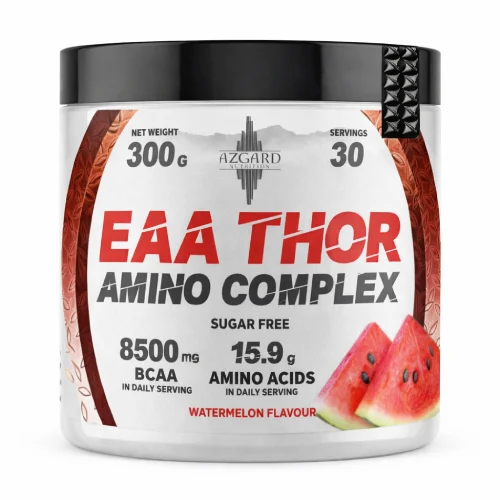 Azgard EAA Thor Amino Complex (300g) sadrži esencijalne aminokiseline (EAA) i visok udio BCAA (8500 mg po dnevnoj dozi), što ga svrstava među najkvalitetnije aminokiseline za trening za MMA, fitness i crossfit sportaše.