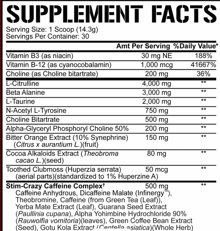 Rich Piana je dao ime “5150” kako bi jasno naglasio da ovaj pre-workout nije za svakoga, već samo za one koji traže krajnje granice izdržljivosti i performansi. Već jedna mjerica isporučuje preko 400 mg kofeina, a ukupno sadrži 513 mg Stim-Crazy kompleksa kofeina – pažljivo kombinovanih izvora kofeina za snažan, dugotrajan i kontrolisan učinak bez nervoze i naglog pada energije.