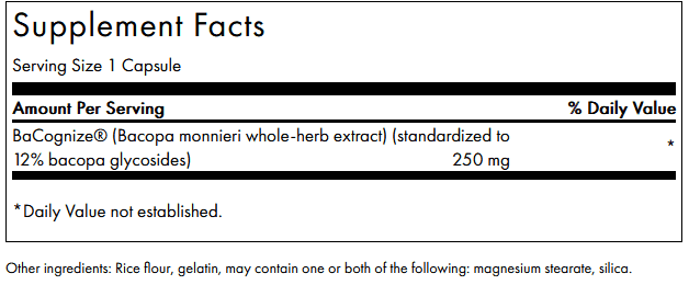 Formulacija sadrži BaCognize® ekstrakt, standardiziran na 12% bacopa glikozida, što garantuje maksimalnu učinkovitost. Također pruža snažnu antioksidativnu zaštitu mozga, pomažući očuvanju zdravlja nervnog sistema.