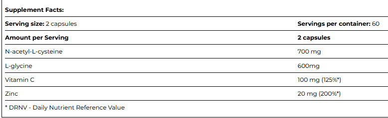 N-acetil-L-cistein i glicin ključni su prekursori glutationa – najvažnijeg prirodnog antioksidansa u tijelu. Ova sinergija doprinosi detoksikaciji, zaštiti stanica od oksidativnog stresa i bržem oporavku organizma. Glicin, osim što podržava sintezu glutationa, ima važnu ulogu u zdravlju kože, zglobova i mišića, a poznat je i po svom pozitivnom utjecaju na kvalitetu sna i regeneraciju.