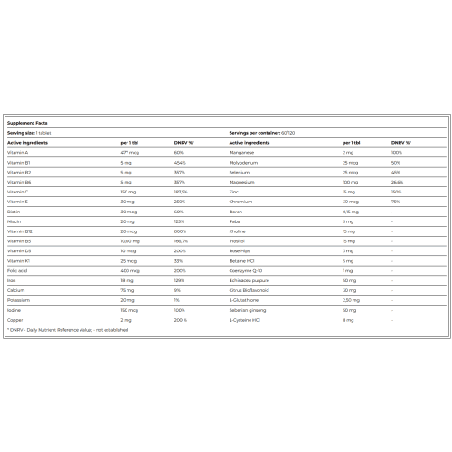 Ova formula sadrži više od 40 esencijalnih vitamina i minerala u kombinaciji sa specijalnim Vit-Amix™ kompleksom, obogaćenim ehinaceom za dodatnu podršku imunitetu i općem zdravlju. Zahvaljujući pažljivo odabranim sastojcima, Multi Mega pomaže u održavanju normalnog metabolizma, doprinosi boljoj fizičkoj i mentalnoj učinkovitosti, te ubrzava regeneraciju nakon napora.