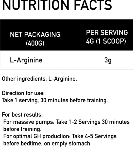 L-arginin je ključna aminokiselina koja podržava pravilno funkcionisanje organizma. Tijelo je koristi za izgradnju proteina i proizvodnju azotnog oksida (NO) – molekule koja širi krvne sudove, poboljšava cirkulaciju i povećava dotok nutrijenata i kisika do mišića.