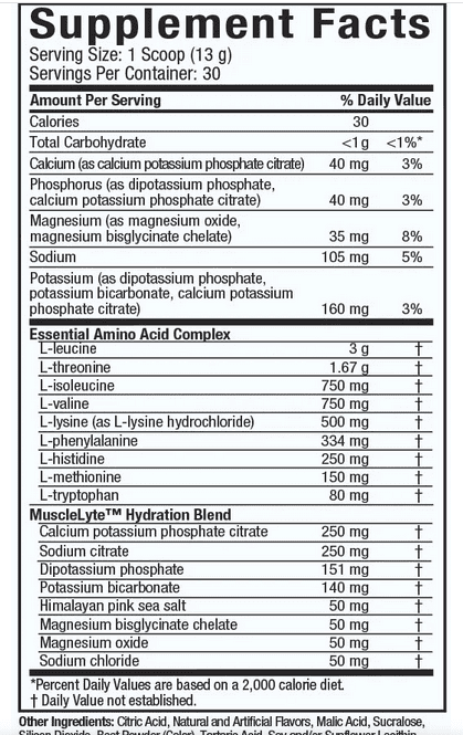Svaka porcija donosi 7,4 g EAA i 4,5 g BCAA, uključujući čak 3 g leucina – ključnog za sintezu proteina i razvoj mišićne snage. Dodani elektroliti pomažu u održavanju ravnoteže tekućine i nadoknadi minerala izgubljenih tokom treninga.